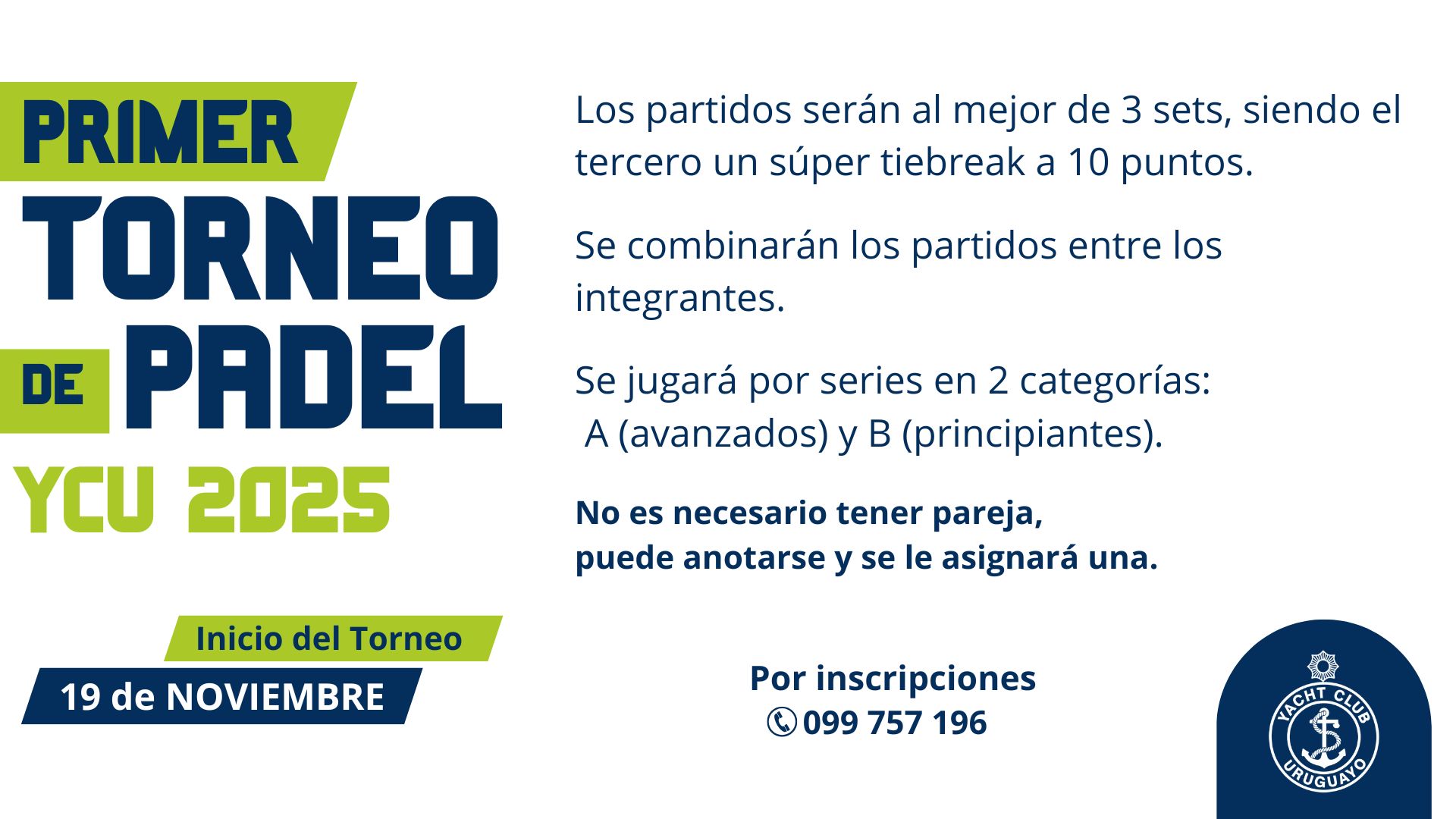 Los invitamos a participar del Primer Torneo de Pádel YCU 2025, iniciará el 19 de Noviembre. ¡No es necesario tener pareja! Puede anotarse y se le asignará una. Los partidos serán al mejor de 3 sets, siendo el tercero un súper tiebreak a 10 puntos y se combinarán los partidos entre los integrantes. Se jugará por series en 2 categorías: A (avanzados) y B (principiantes). ¡No se lo pierda!