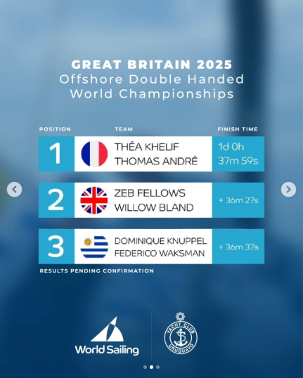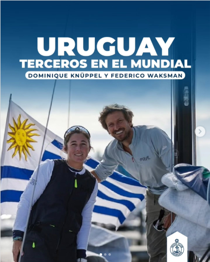 Felicitamos a nuestros socios Dominique Knüppel y Federico Waksman, quienes conquistaron la medalla de bronce en el Campeonato del Mundo de Regata Oceánica en Dobles Mixtos, disputado en Cowes (Isla de Wight, Reino Unido). A bordo de un Sun Fast 30 de 9 metros, la dupla uruguaya logró un histórico 3er puesto entre 11 barcos en la final, luego de más de 28 horas de regata en condiciones de poco viento y fuertes corrientes. Compitiendo codo a codo hasta las últimas millas frente a los equipos de Francia y Gran Bretaña, que finalmente se quedaron con el oro y la plata, Dominique y Federico dejaron en alto el nombre de Uruguay en un Mundial con 22 equipos de 14 países. Un logro histórico para la vela oceánica uruguaya y un orgullo inmenso para todo el Yacht Club Uruguayo. ¡Felicitaciones Dominique y Federico!